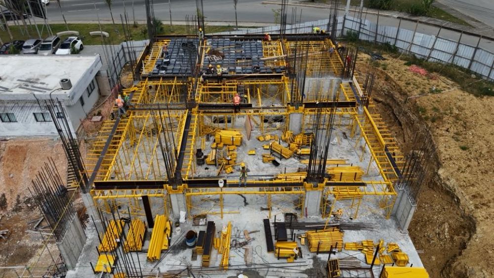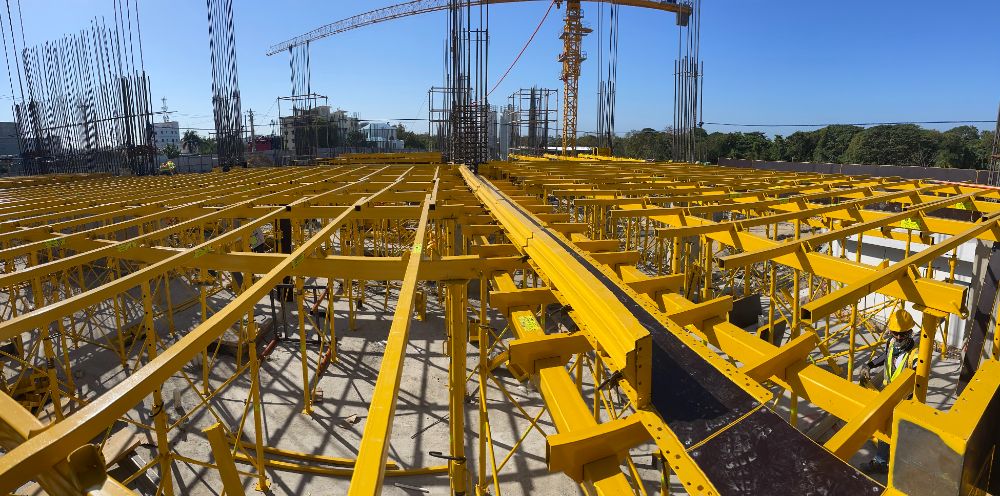 Sistema de encofrado metálico ANDESCOL diseñado a la medida, que garantizó rigidez y seguridad mediante crucetas estructurales. El sistema incorporó vigas principales y secundarias para soportar el aligeramiento con casetones plásticos, así como formaleta metálica especial para resolver las transiciones entre columnas, vigas y losa, asegurando continuidad estructural durante el vaciado monolítico.